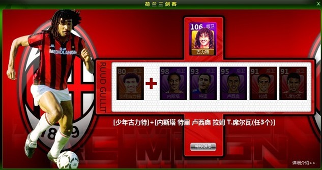 少年古力特+内斯塔、特里、卢西奥、拉姆、T•席尔瓦(其中任意3个)可以合成巨星初始能力106后卫古力特。