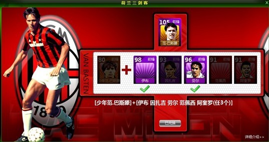 少年范•巴斯滕+伊布、因扎吉、劳尔、范佩西、阿奎罗(其中任意3个)可合成巨星初始能力为105的范•巴斯滕。
