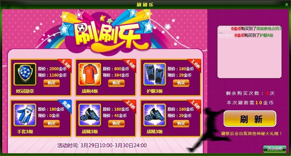 2、在活动期间内,每天不限制刷新次数。每天前3次的刷新是免费的,此后每次刷新需消耗10金币。