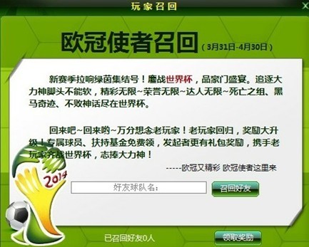 活动内容:活动期间内,我们都来邀请老玩家回归到我们的绿茵团队中,你选择召回的老玩家只要回归游戏,即可在游戏“礼包中心”内免费领取回归专属礼包一份,内含初始能力92的神秘大牌球员一名哦!同时还可免费领取回归扶持基金礼呢!根据召回老玩家的数量不同,还有更劲爆的礼包奖励送给你!让老玩家们都回归吧,一起分享世界杯的金色荣光吧!