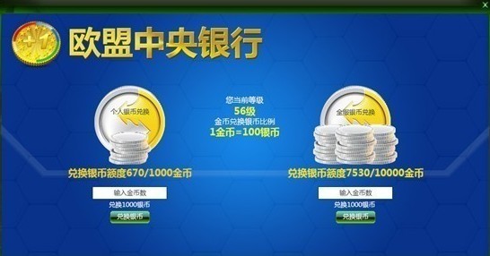 ”即可进入欧盟银行活动界面,利用金币即可兑换银币哦!兑换比例最高可达1金币=120银币哦!活动时间仅此一天,限时限量!