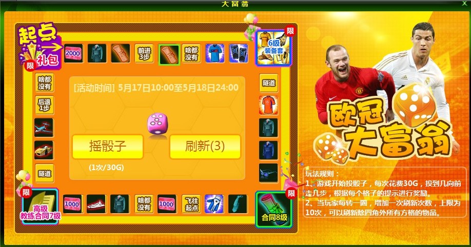 仓啷啷掷出宝骰,哗啦啦好运连连,诸多幸运大礼遍布在你的大富翁梦想之路上。看那角落大礼竟是6级装备套,8级合同,7级高教合同,起点礼包呢,这就得看你有没有福气得到喽~欧冠大富翁欢乐无限极,大富翁是你是你还是你,快来参与吧!