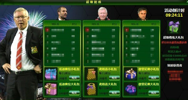 ”进入活动界面。玩家可购买三位教练的大/小礼包,不仅可随机获得教练经验卡、金宝箱、2级高教合同、3级高教装备等道具,购买礼包还可获得积分呢~在活动截止时每位教练栏中积分榜第一者可获得超级教练大礼包哟~~里面藏着欧冠之魂、8级球员合同、7级高教合同等好东西咧。悄悄地告诉你,像7级高教合同可是你提升高教等级的必须品呀!