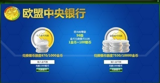 ”即可进入欧盟银行活动界面,利用金币即可兑换银币哦!兑换比例最高可达1金币=120银币哦!
