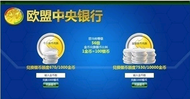 ”即可进入欧盟银行活动界面,利用金币即可兑换银币哦!兑换比例最高可达1金币=120银币哦!