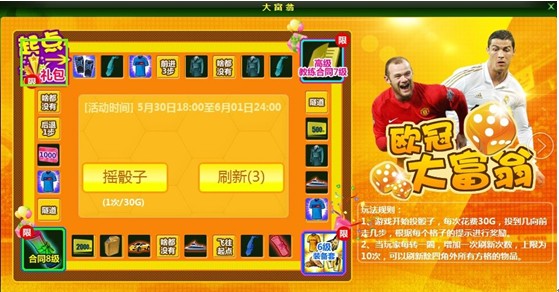 ”来玩欧冠大富翁。哈哈,要过节啦,要过孩纸节啦,要过富翁节啦,您仅需消耗30金币即可掷1次骰子,骰子显示几点就走几步。六一六一好运气快快来!不仅有诸多幸运大礼遍布在你的大富翁梦想之路上。富翁角落大礼竟是7级高教合同,6级装备套,8级合同,起点礼包呢,如此这般梦想之礼看你有没有福气得到喽~欧冠大富翁喜迎儿童节,是不是孩纸都得来玩哟~
