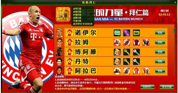 1、5月31日24:00攻陷拜仁活动重置后,原先在最后一个活动日增加拜仁慕尼黑11将士全亮大奖!通过球会成员的不懈努力,11位拜仁球员的球衣及中文名称全部点亮,球会凡符合领取奖励资格的会员均可领取一份超级奖励,奖励包含:7级合同、5级装备套、战术积分5000点。奖励会直接发放到玩家背包中。