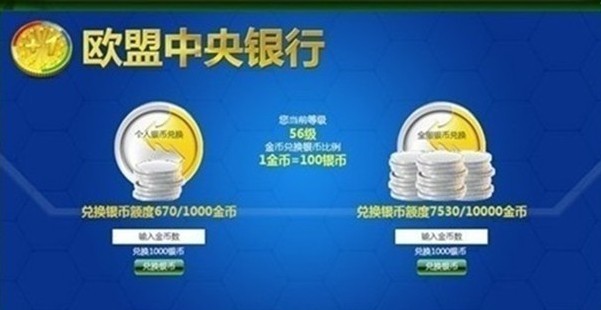 ”即可进入欧盟银行活动界面,利用金币即可兑换银币哦!兑换比例最高可达1金币=120银币哦!银币兑换限时限量,不要错过大好机会哦~