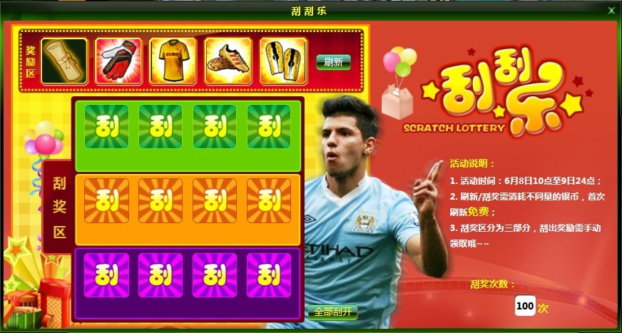 ”来刮大奖。在刮奖区最低仅需200银币就可参与刮奖喽,你有可能刮出7级合同,6级球员装备,限量积分等奖励,当刮出的道具材料与奖励区展示的道具材料相同,那你就可以消耗一定金币领取该奖励喽~如果你刮出了“球网”,则可以花费一定金币领取奖励区展示的5个道具材料啦。