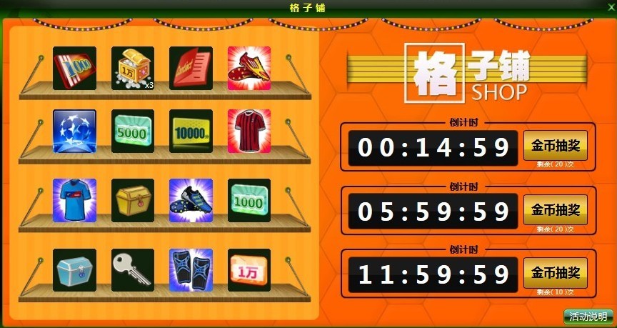 ” 即可开始格子铺抽奖活动。格子铺3档抽奖,倒计时归0时,即可进行格子铺免费抽奖,格子铺为大家准备了精美大礼,欧冠之魂、5级球员装备、5级高教合同、银币兑换包(中)、战术积分、限量积分等超级幸运奖期待你来抽取哦~分秒必争的你,如果不堪忍受等待之苦,也可以立即花一定量的金币进行抽奖哦!每日每人抽奖次数有限,机会难得哦~