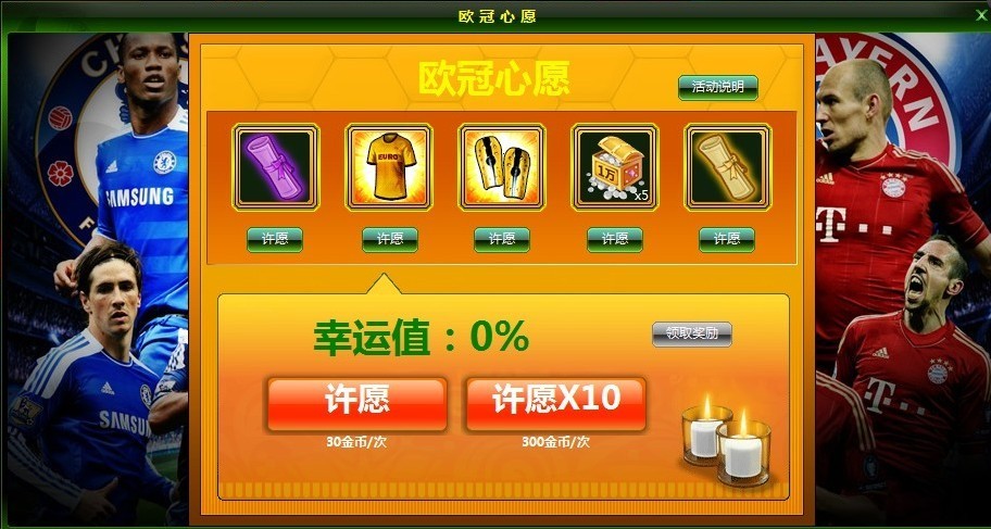 ”入口参与欧冠心愿活动。许愿窗内摆着五款你超想得到的装备大礼,玩家自由挑选其中一个礼包进行许愿,最低仅需2金币就可参与活动哟~闭合双眸心中愿望汇聚发酵,梦寐以求的装备道具也许就属于你啦!