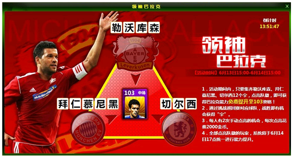 ”。玩家只要通过打巡回赛勒沃库森、拜仁慕尼黑、切尔西,每胜一场将有机会获得1个应球队名称的中文字,只要三支球队的的队名全部点亮,你就获得巴拉克能力提升的资格。