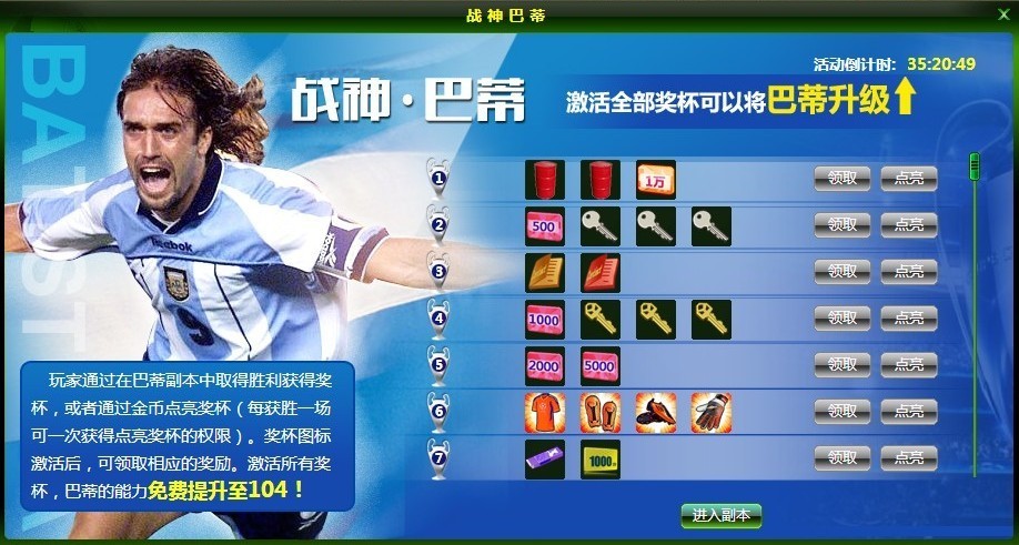 4、玩家点亮全部20个奖杯且阵容中已拥有巴蒂副本的巨星巴蒂斯图塔(位置:前锋,初始能力94)将于