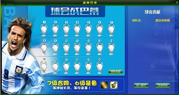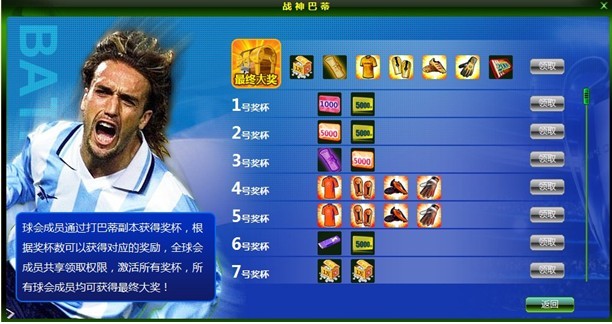 - 球会成员每通关一次巴蒂副本,即可随机获得某号码奖杯,每一个奖杯对应一个大奖,当20个奖杯全部点亮,球会中符合领取条件的成员均可领取最终大奖。以上奖励每人限领1次。