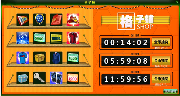 ” 即可开始格子铺抽奖活动。格子铺3档抽奖,倒计时归0时,即可进行格子铺免费抽奖,格子铺为大家准备了精美大礼,欧冠勋章、欧冠之魂、5级球员装备、5级高教合同、战术积分10000、限量积分1000等超级幸运奖期待你来抽取哦~分秒必争的你,如果不堪忍受等待之苦,也可以立即花一定量的金币进行抽奖哦!每日每人抽奖次数有限,机会难得哦~