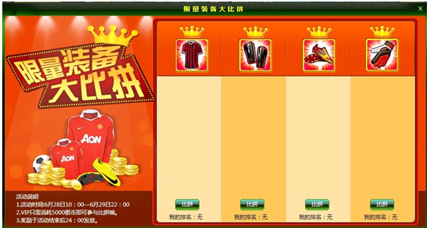 ”参与比拼活动。把牛气的5级和6级限量装备拿出来炫耀一下吧,只需5000银币就可以报名比拼喽~谁的限量装备能夺得排行榜第一呢?勇夺第一得倍儿有面子的限量版大奖,银币双倍卡、回豆卡、立即返回卡、跳过次数卡,更有还有专属球队头像及上线提示呢~哈哈,炫耀自己的限量装备,让别人羡慕嫉妒恨去吧~~