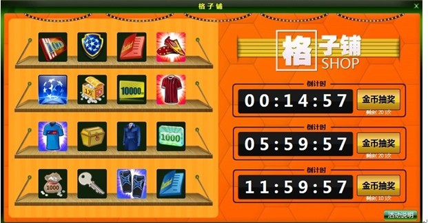 活动内容:活动期间内,格子铺设立3档抽奖,倒计时归0时,即可进行格子铺免费抽奖,格子铺为大家准备了精美大礼,欧冠勋章、欧冠之魂、银币兑换包(中)、5级球员装备、5级高教合同、战术积分10000等超级幸运奖期待你来抽取哦~分秒必争的你,如果不堪忍受等待之苦,也可以立即花一定量的金币进行抽奖哦!每日每人抽奖次数有限,机会难得哦!