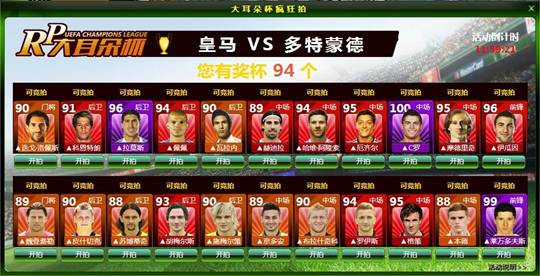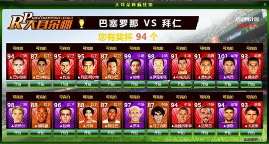 ”参与球员竞拍活动,大家可利用在RP大耳朵杯活动中收集到的大耳朵杯进行球员大竞拍。押奖杯数量最多者,获得对应球员。所有的竞拍球员均来自皇马、巴萨、拜仁、多特蒙德哦!你的偶像出现在你眼前,你怎能不动心?哈哈哈,机会难得哦,快用你的大耳朵杯疯狂竞拍吧!