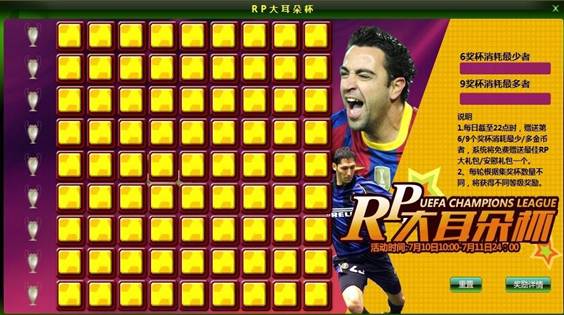 4、活动期间,每日截止22:00时,获得第6个奖杯消耗最少金币者,系统将免费赠送最佳RP大礼包,礼包内含:1-6级合同各一个,一套5级装备套,战术积分卡5000点。同时,获得第9个奖杯消耗最多金币者,系统将免费赠送安慰礼包,礼包内含:球员经验卡10000点。