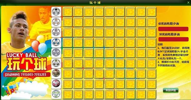3、活动期间,每日截止24:00时,翻得第6个球消耗最少金币者,系统将免费赠送最佳RP大礼包,礼包内含:1-6级合同各一个,一套5级装备套,战术积分卡5000点。同时,获得第9个球消耗最多金币者,系统将免费赠送安慰礼包,礼包内含:球员经验卡10000点。最佳RP礼包及安慰礼包会直接发放到符合条件的玩家背包中。
