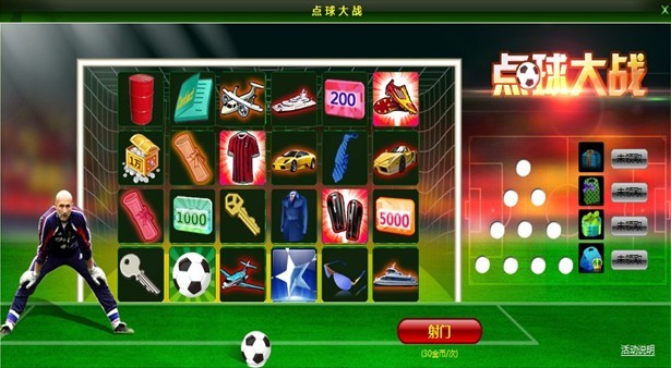 活动内容:在活动期间内,玩家参与点球大战活动,24件道具展现在球门框内,玩家仅需30金币点击射门按钮可随机获得一件道具哟,像5级球员装备、5级签约道具、3级高教装备、金/银钥匙、足球等超级大礼你想不想要啊?想要就来拼命射啊!哦耶!