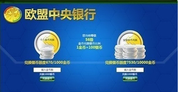 活动内容:在活动期间内,球队等级30级以上的玩家来欧盟银行兑换银币,不仅可以使用金币兑换,更可以使用活动券来兑换银币,兑换比例最高可达1金币(活动券)=120银币哦!