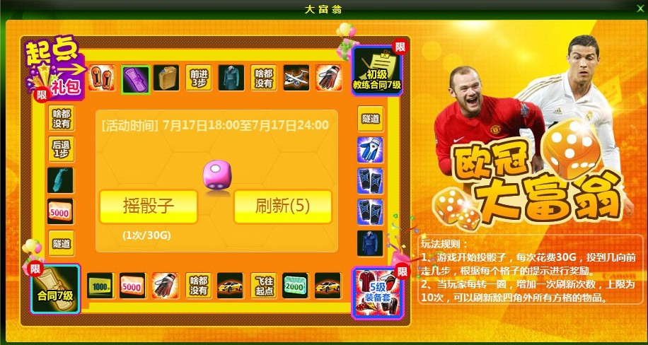 活动内容:在活动期间内,您仅需消耗30金币即可掷1次骰子,骰子显示几点就走几步。各种妙礼遍布在你的大富翁梦想之路上。富翁角落大礼起点礼包、初教合同7级,5级装备套,7级合同呢,如此这般梦想之礼看你有没有福气得到喽~