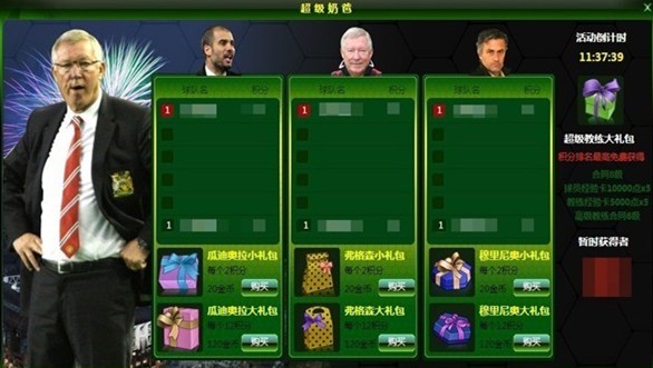活动内容:在活动期间内,参与“超级奶爸”活动的玩家在购买三位教练的大/小礼包时不仅可随机获得诸多道具装备,购买礼包的同时还可获得积分呢~在活动截止时每位教练栏中积分榜第一者可获得超级教练大礼包哟~~里面藏着合同7级、球员经验卡10000点、教练经验卡5000点、高级教练合同6级呢~