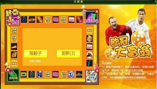 2、在界面的四角方格中,大礼尤为丰富哦。如玩家完成一圈刚好落在起点格上会获得起点礼包,内含:战术积分卡20000点*1,银币兑换包(中)*5,欧冠之魂*3,教练经验卡5000点*1、球员训练卡10000点*1。内含的道具材料将会直接发放到玩家背包中,请注意查收。