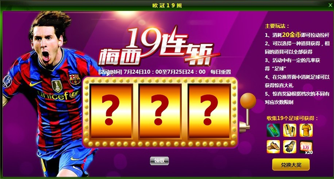 活动内容:在活动期间内,大家都来体验梅西19连斩那其乐无穷的游戏环节吧。玩家只需消耗20金币就可拉动一次摇杆,你就有机会获得相当丰厚的幸运道具或装备呢~