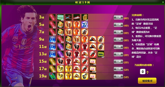 9球奖:欧冠之魂*2,合同5级*4,银币兑换包(中)*5,4级护腿*4,4级战袍*4,4级战靴*2,4级手套*2。每人每天可兑换3次。