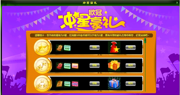活动内容:我们的欧冠冲星豪礼来了!在活动期间内,玩家通过消费金币达到不同的星级,可领取及购买对应星级大礼。福运到来挥之不去,身为VIP或单日消费满100金币即可品尝一星之礼美滋味。