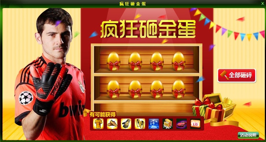 1、活动界面中有8枚金蛋,每砸一枚需要消耗49金币。但是如果玩家选择全部砸碎则仅需350金币。但要注意的是,如果最初玩家没有选择全部砸碎模式,而是在选择单个砸蛋后再选择全部砸碎,这种情况下的全部砸碎所消耗的金币量是按照单个49金币的价格来计算。