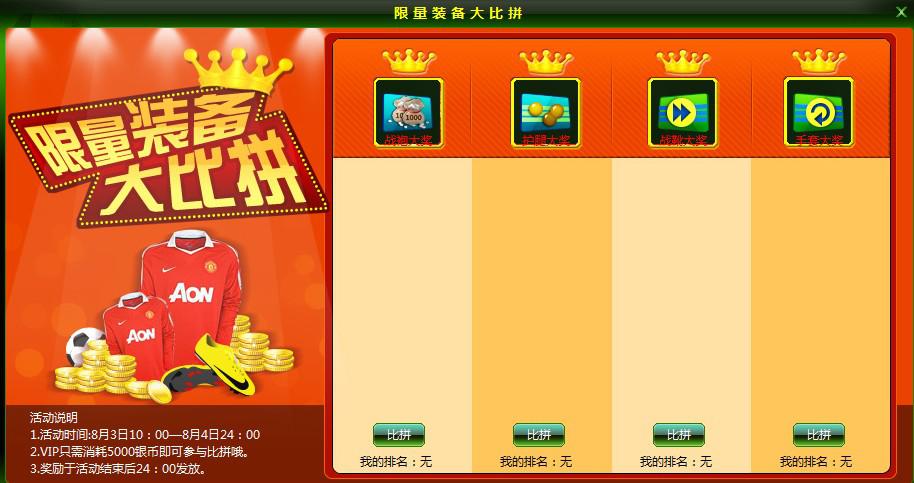活动内容:在活动期间内,VIP功能的玩家一定要来参与限量装备大比拼活动。把自己5级和6级限量装备拿出来炫耀一下,只需5000银币就可以报名比拼喽~谁的限量装备能夺得排行榜第一呢?榜首第一者奖励银币双倍卡、回豆卡、立即返回卡、跳过次数卡,更有还有专属球队头像及上线提示呢~