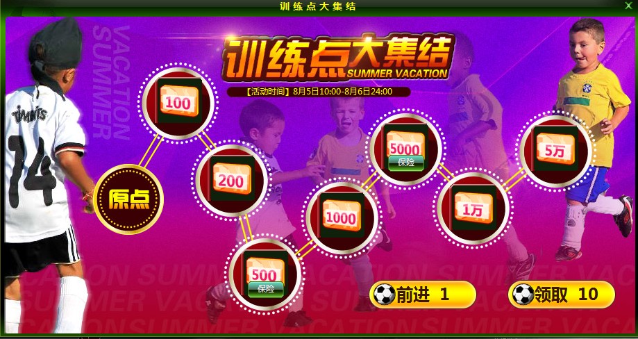 活动内容:在活动期间参与活动,玩家从原点开始,通过消耗金币前进,第一步仅需3金币,玩家前进中可领取停留格内的训练点卡一张,第七步格内有50000训练点卡等你来夺。每个活动日最多能领10次训练卡,如此良机怎容错过,火速集结中……