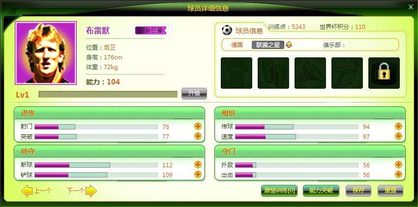 球员姓名:诺伊尔,产出地:德甲,位置:门将,原品质/能力:大牌91,更新后品质/能力:巨星93
