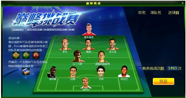 活动内容:活动期间,玩家参与“巅峰挑战赛”活动,即可挑战拜仁慕尼黑,获胜即可获得银币、训练点和声望,每日单服达到1500次胜场的时候,根据进球数量对玩家进行排名,前三名玩家有神秘礼包奥,每日更有一份终极击败大奖献给全服取得第1000场胜利的玩家奥,机会难得,快来挑战吧。