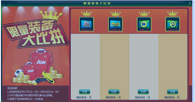 活动内容:在活动期间内,VIP功能的玩家一定要来参与限量装备大比拼活动。把自己5级和6级限量装备拿出来炫耀一下,只需5000银币就可以报名比拼喽~谁的限量装备能夺得排行榜第一呢?榜首第一者奖励银币双倍卡、回豆卡、立即返回卡、跳过次数卡,还有专属球队头像及上线提示呢~