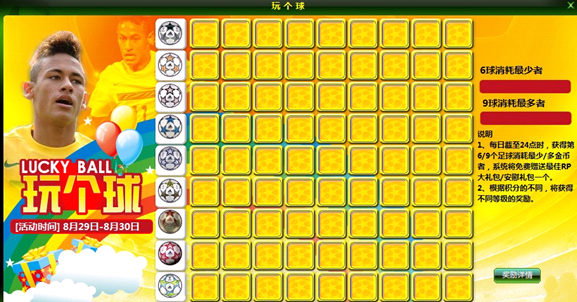 3、活动期间,每日截止24:00时,翻得第6个球消耗最少金币者,系统将免费赠送最佳RP大礼包,礼包内含:1-6级合同各一个,一套5级装备套,战术积分卡5000点。同时,获得第9个球消耗最多金币者,系统将免费赠送安慰礼包,礼包内含:球员经验卡10000点。最佳RP礼包及安慰礼包会直接发放到符合条件的玩家背包中。