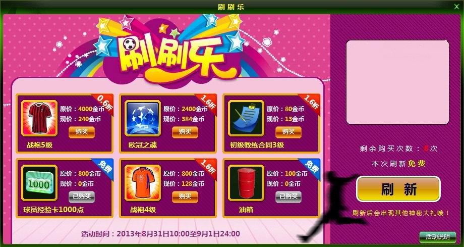 活动内容:在活动期间内,点击刷刷乐活动页中的“刷新”按钮即可随机刷出6款炫魅道具以及随机劲爆折扣。欧冠勋章、竞技勋章、6级装备等各种美轮美奂的精品道具等你来刷出超级折扣!刷刷乐最美瞬间就是你很有可能刷出免费购买道具的机会!刷刷乐优惠道具限时限量限购哟~