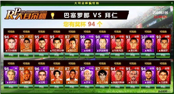 活 动内容:在活动期间内,玩家进入“RP大耳朵杯拍卖”参与球员竞拍活动,大家可利用在RP大耳朵杯活动中收集到的大耳朵杯进行球员大竞拍。押奖杯数量最多 者,获得对应球员。所有的竞拍球员来自巴萨、拜仁哦!你的偶像出现在你眼前,你怎能不动心?哈哈哈,机会难得哦,快用你的大耳朵杯疯狂竞拍吧!