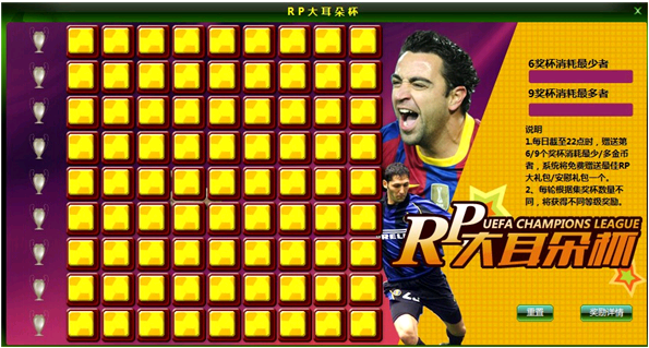 4、活动期间,每日截止22:00时,获得第6个奖杯消耗最少金币者,系统将免费赠送最佳RP大礼包,礼包内含:1-6级合同各一个,一套5级装备套,战术积分卡5000点。同时,获得第9个奖杯消耗最多金币者,系统将免费赠送安慰礼包,礼包内含:球员经验卡10000点。