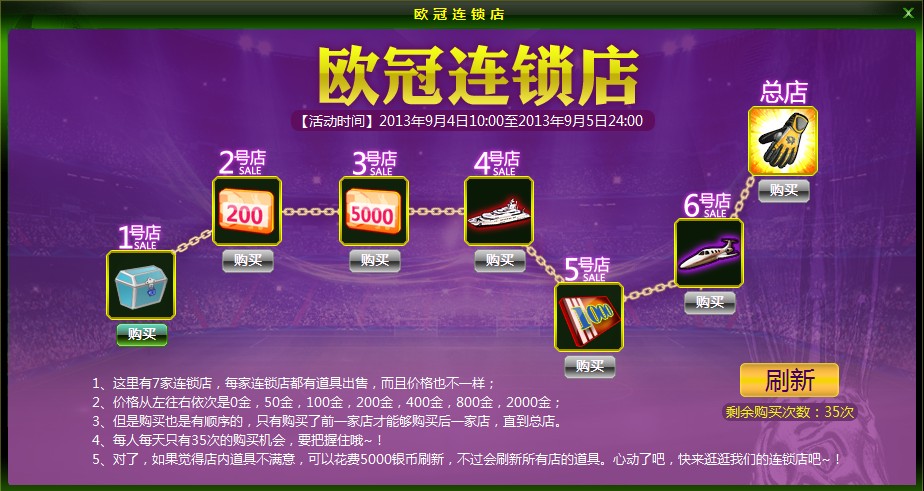活动内容:在活动期间内,让我们一起涌入“欧冠连锁店”吧,界面中依次有7家店铺,每家店铺都出售一种道具。玩家按照店铺顺序购买,1号店道具免费购买喔~剩下的店铺需使用金币(活动券)购买道具。每人每天能购买35次呢~如果你对上架的道具不满意,还可以消耗5000银币刷新哟,说不定能刷出更好的道具呢~