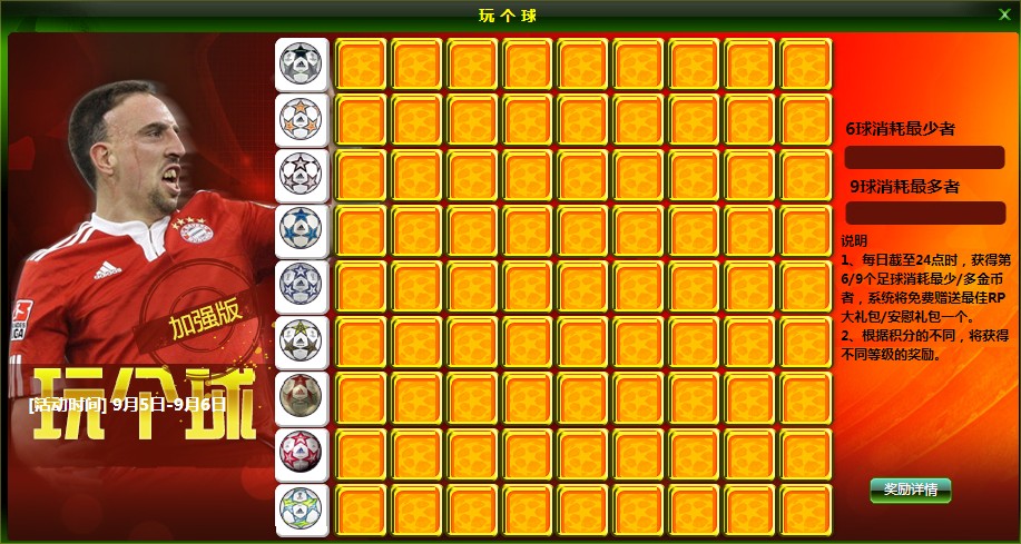 3、活动期间,每日截止24:00时,翻得第6个球消耗最少金币者,系统将免费赠送最佳RP大礼包,礼包内含:7级合同一个,5级装备套一套,战术积分卡10000点。同时,获得第9个球消耗最多金币者,系统将免费赠送安慰礼包,礼包内含:球员经验卡10000点,训练卡100000点,战术积分卡10000点,袖标4级*1。最佳RP礼包及安慰礼包会直接发放到符合条件的玩家背包中。