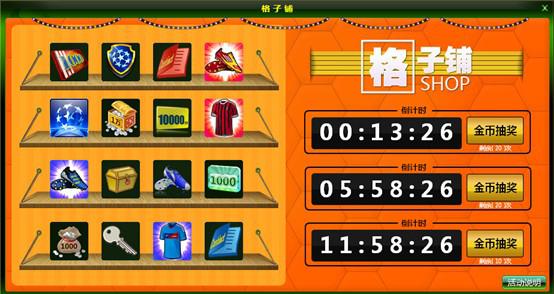 活动内容:活动期间内,格子铺设立3档抽奖,倒计时归0时,即可进行格子铺免费抽奖,格子铺为大家准备了精美大礼,欧冠勋章、欧冠之魂、银币兑换包(中)、限量积分、战术积分等超级幸运奖期待你来抽取哦~分秒必争的你,如果不堪忍受等待之苦,也可以立即花一定量的金币进行抽奖哦!每日每人抽奖次数有限,机会难得哦!