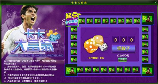 活动内容:卡卡大富翁活动显然要给球队中拥有卡卡的玩家送上大福利喽,在活动期间,仅需花费50金币就掷出三个骰子,其中骰子最小的点数即为前进的步数,每一小格都有2张卡卡升级卡,当然如果运气好落到除起点外的角落大格所获得的卡卡升级卡会更多,当玩家拥有500张卡卡升级卡就可以对球队中的卡卡进行能力升级,升级后的卡卡初始能力达103!妖人卡卡来了!