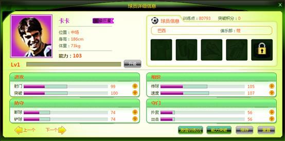 3、只要拥有500张卡卡升级卡就可以升级卡卡,获得签约权并拿到500张升级卡就可以点击界面中的升级按钮,对队中的卡卡进行能力升级,初始能力提升至103。卡卡升级后保留等级、突破积分、世界杯积分、激情训练值,但会卸下训练点。