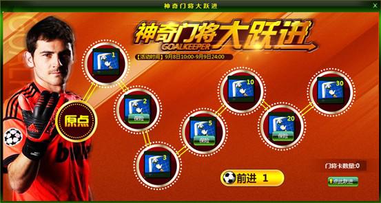 活动内容:在活动期间内,玩家从原点开始,通过消耗金币前进,每成功前进一步就可获得相应数量的神奇门将卡。通过积攒神奇门将卡,消耗不同数量的神奇门将卡可以将活动指定的门将能力进行提升哦~如果是VIP功能的玩家,参与此次活动会免费获得5张神奇门将卡,嘿嘿!