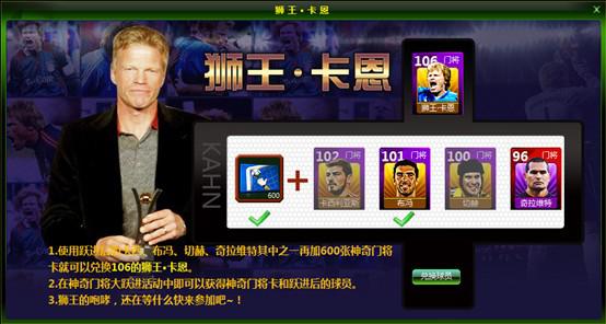 1、玩家必须通过神奇门将大跃进活动,将卡西利亚斯、布冯、切赫、奇拉维特其中一位进行跃进,并且再加600张神奇门将卡就可以兑换初始能力106狮王·卡恩。兑换后,保留等级、突破积分、世界杯积分、激情训练点,但会卸下训练点。