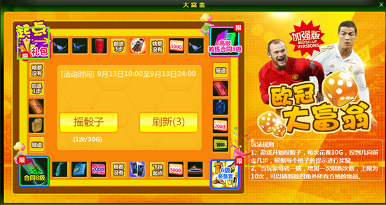 2、在界面的四角方格中,大礼尤为丰富哦。如玩家完成一圈刚好落在起点格上会获得起点礼包,内含:战术积分10000*5,银币兑换包(中)*5,欧冠之魂*5,教练经验卡5000点*2、训练点10000*2。内含的道具材料将会直接发放到玩家背包中,请注意查收。